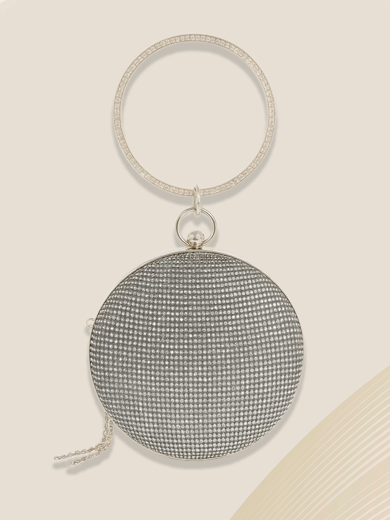 A dazzling round clutch adorned with concentric crystals and a sleek metallic bangle handle — the definition of modern elegance.